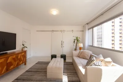 As salas de estar e jantar são integradas, proporcionando um ambiente amplo e com muita iluminação natural. O apê também conta com 2 salas de TV, lavabo, cozinha equipada, copa, lavanderia e dependência completa de empregada, oferecendo praticidade e funcionalidade para o dia a dia.