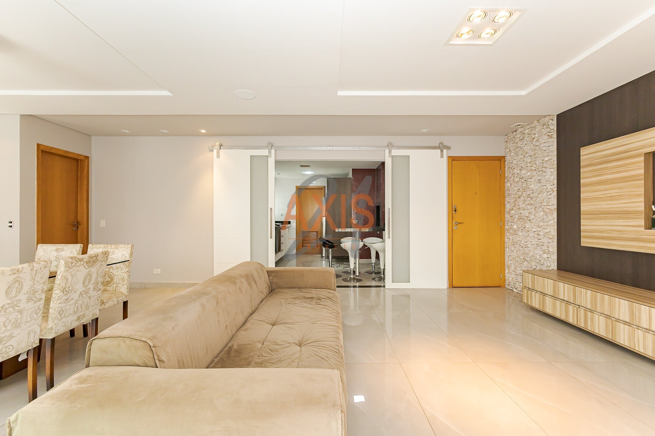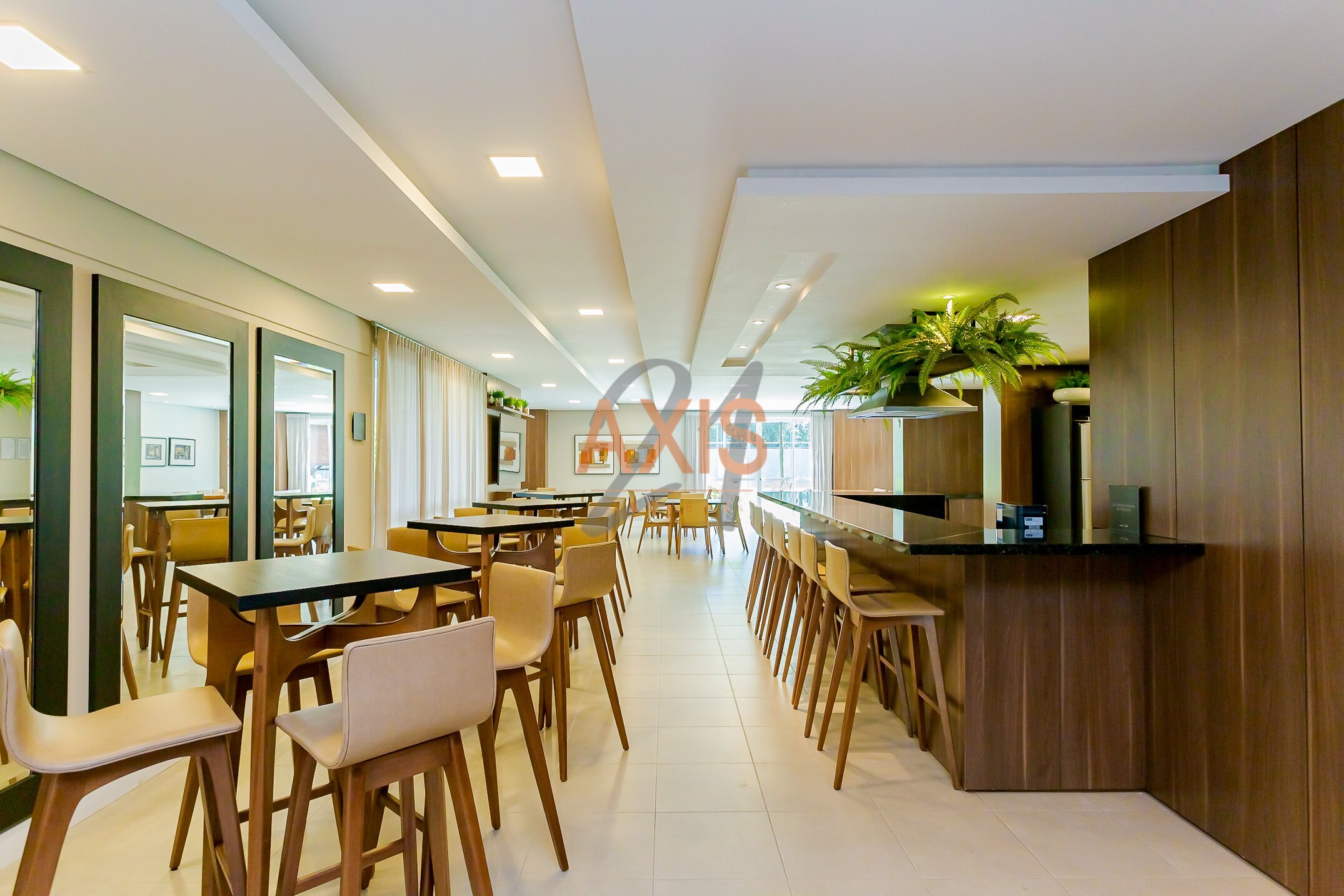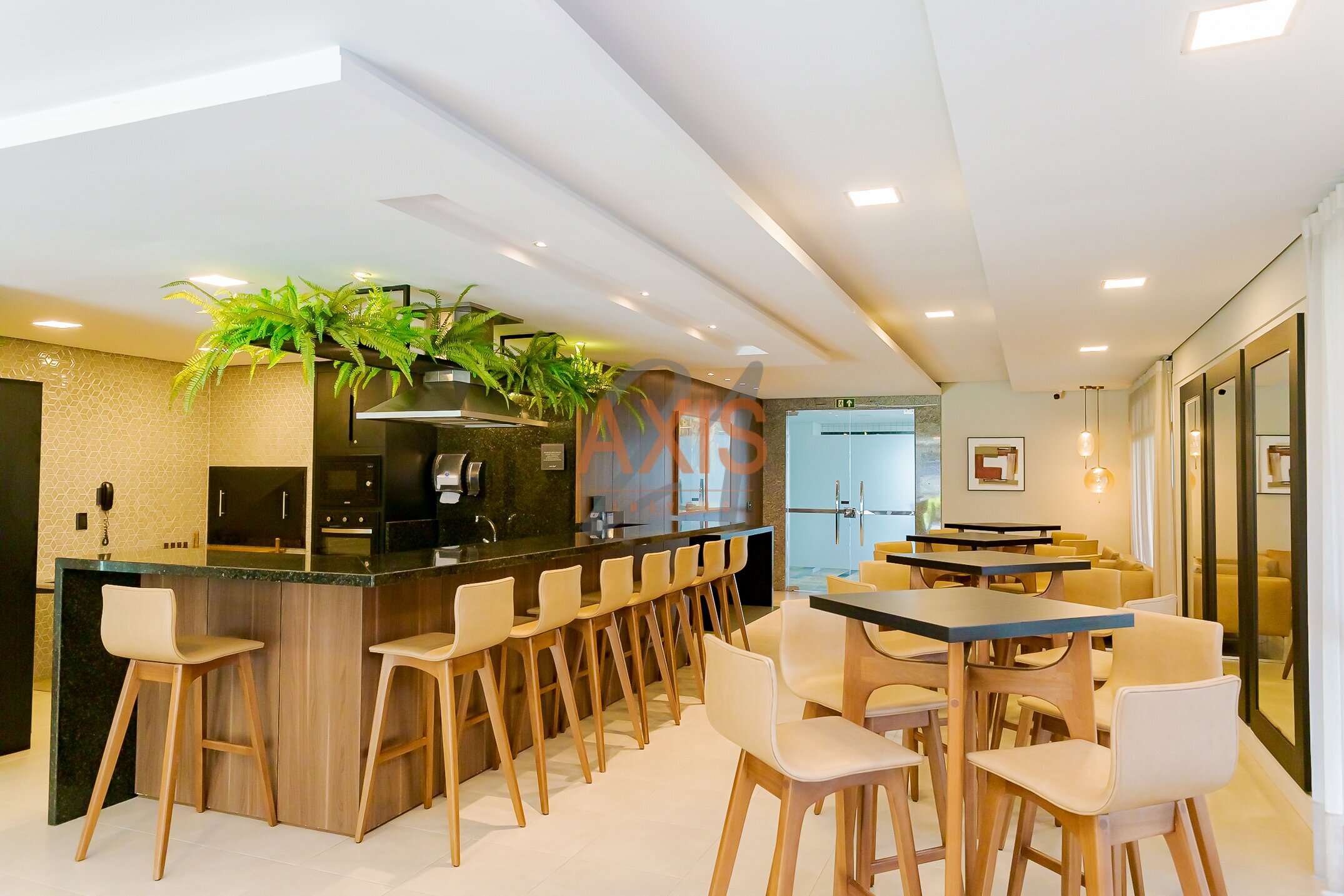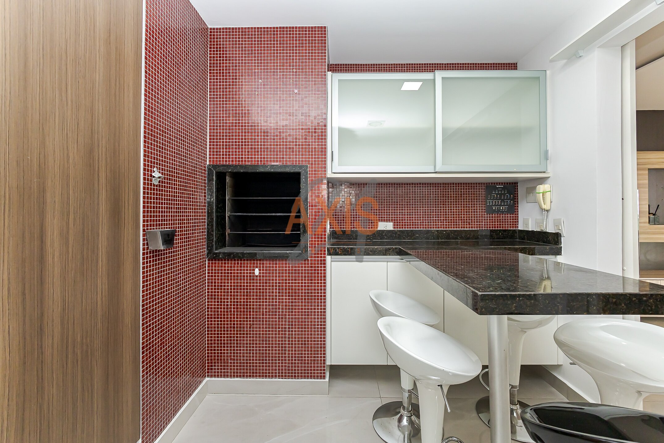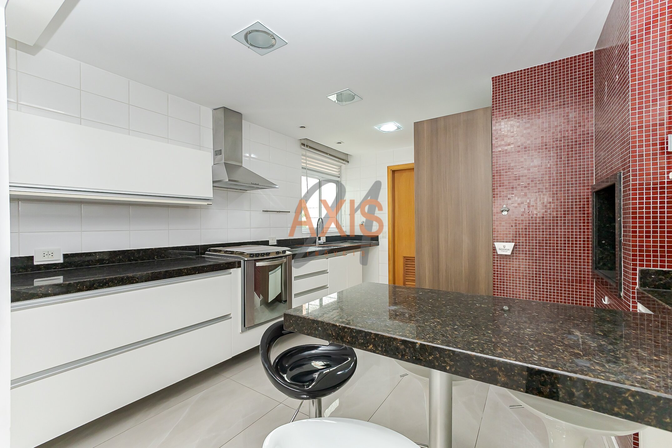 - cozinha estilo americana com armários e churrasqueira, bancada em granito;