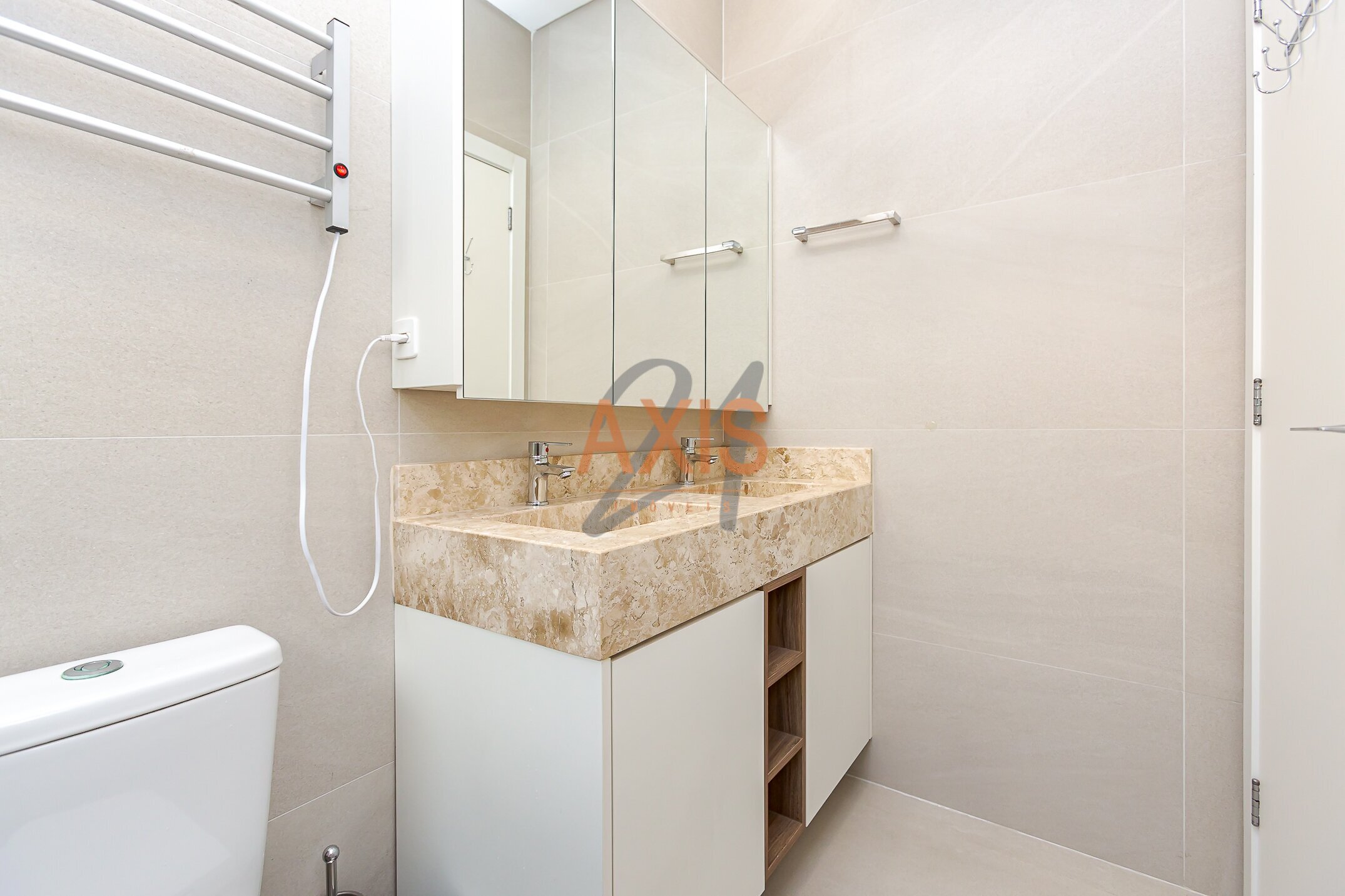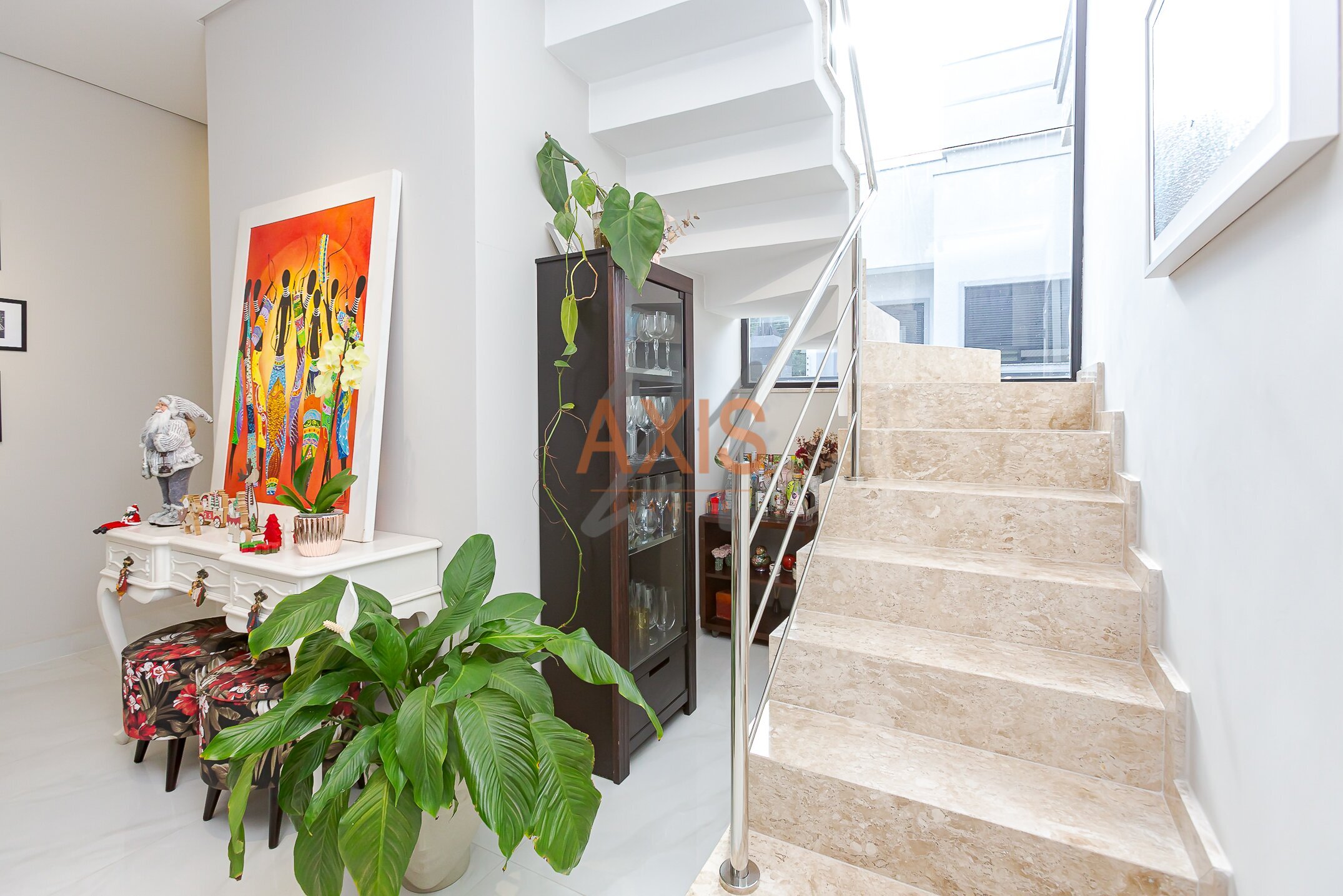 No térreo, o imóvel conta com sala de estar e jantar integradas à cozinha totalmente mobiliada com armários e eletrodomésticos, lavabo, lavanderia e amplo quintal. A escada em mármore travertino e os vidros amplos proporcionam excelente iluminação natural.